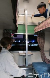 初日の12日、寝台特急「あけぼの」の車両では、窓にはめ込んだスクリーンで寝台特急の車窓を撮影した映像を映すとともに、その音声にあわせてシートが振動する機械が設置されました。