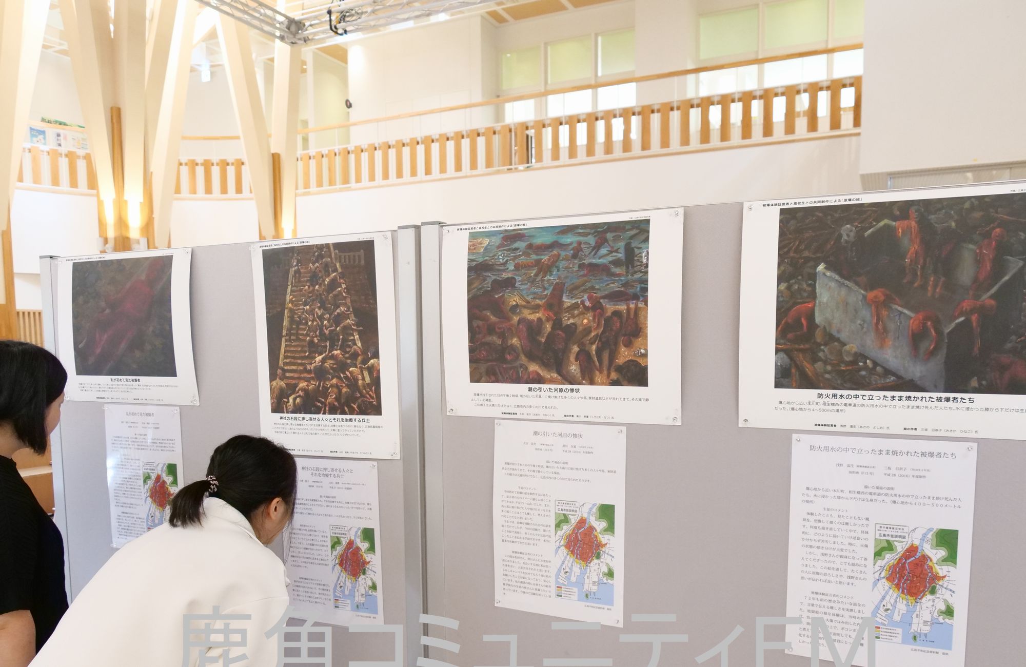 被爆者の証言を基に高校生が描いた絵画の企画展が鹿角市で開かれていて、一発の原子爆弾がもたらした残酷な光景が平和の尊さを訴えています。