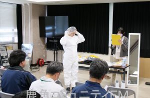 また防護服を着る訓練も行われ、つなぎ型のものを2枚重ねて着て、手袋、マスク、ゴーグルなどとの境目をテープで密閉していました。