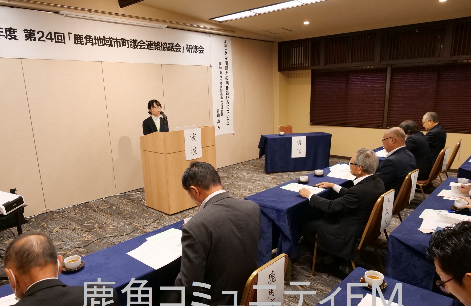 これは、22日に花輪のホテルで開かれた鹿角市と小坂町の議会の研修会です。鹿角市の議員は前の週にもクマ対策の研修に参加しており、事態の深刻さが表れています。