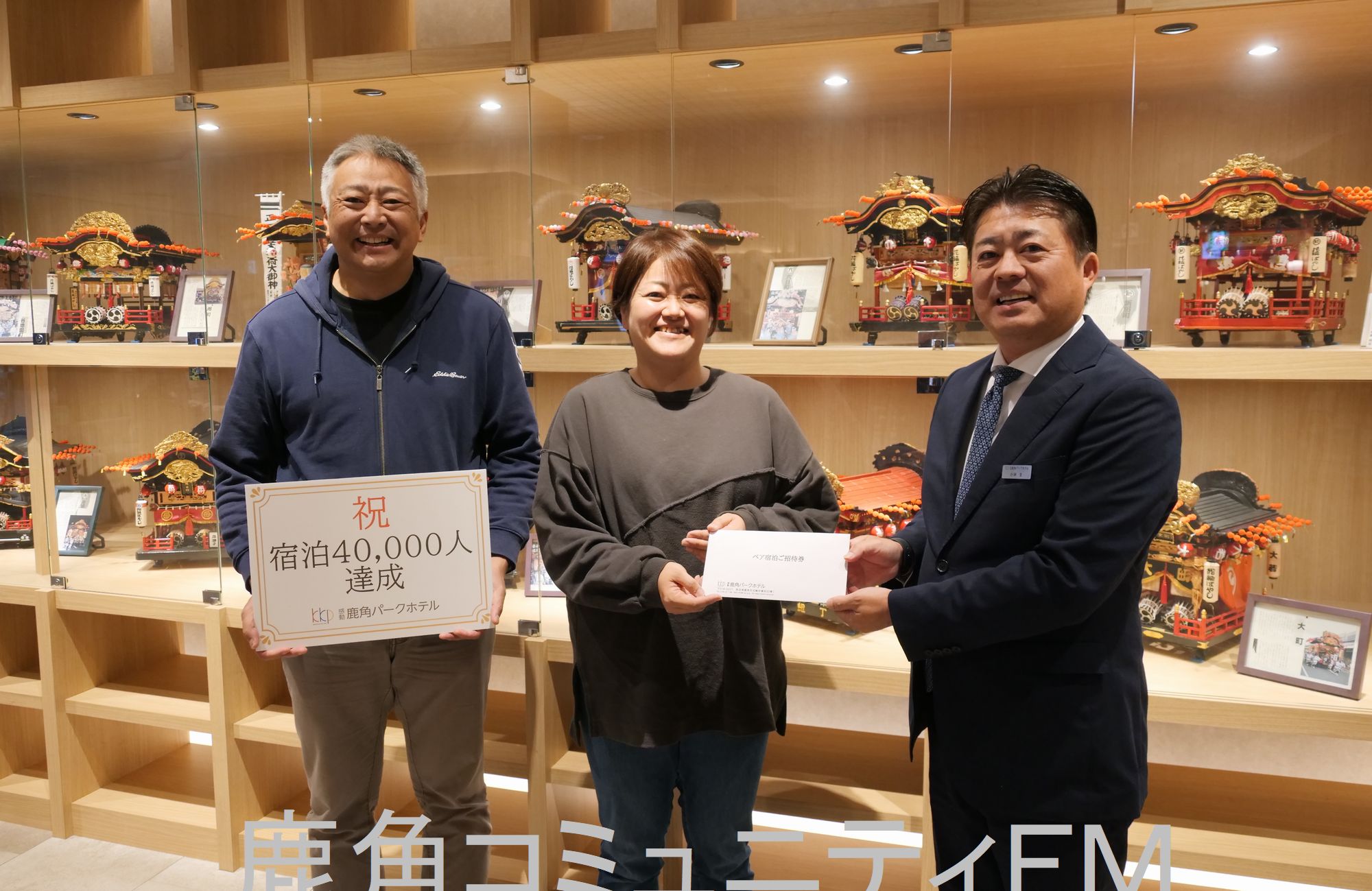 鹿角市の中核ホテルの宿泊者の数がリニューアルオープンから4万人に達し、記念のセレモニーが行われました。まちのにぎわい拠点として、さらなる進展が期待されています。