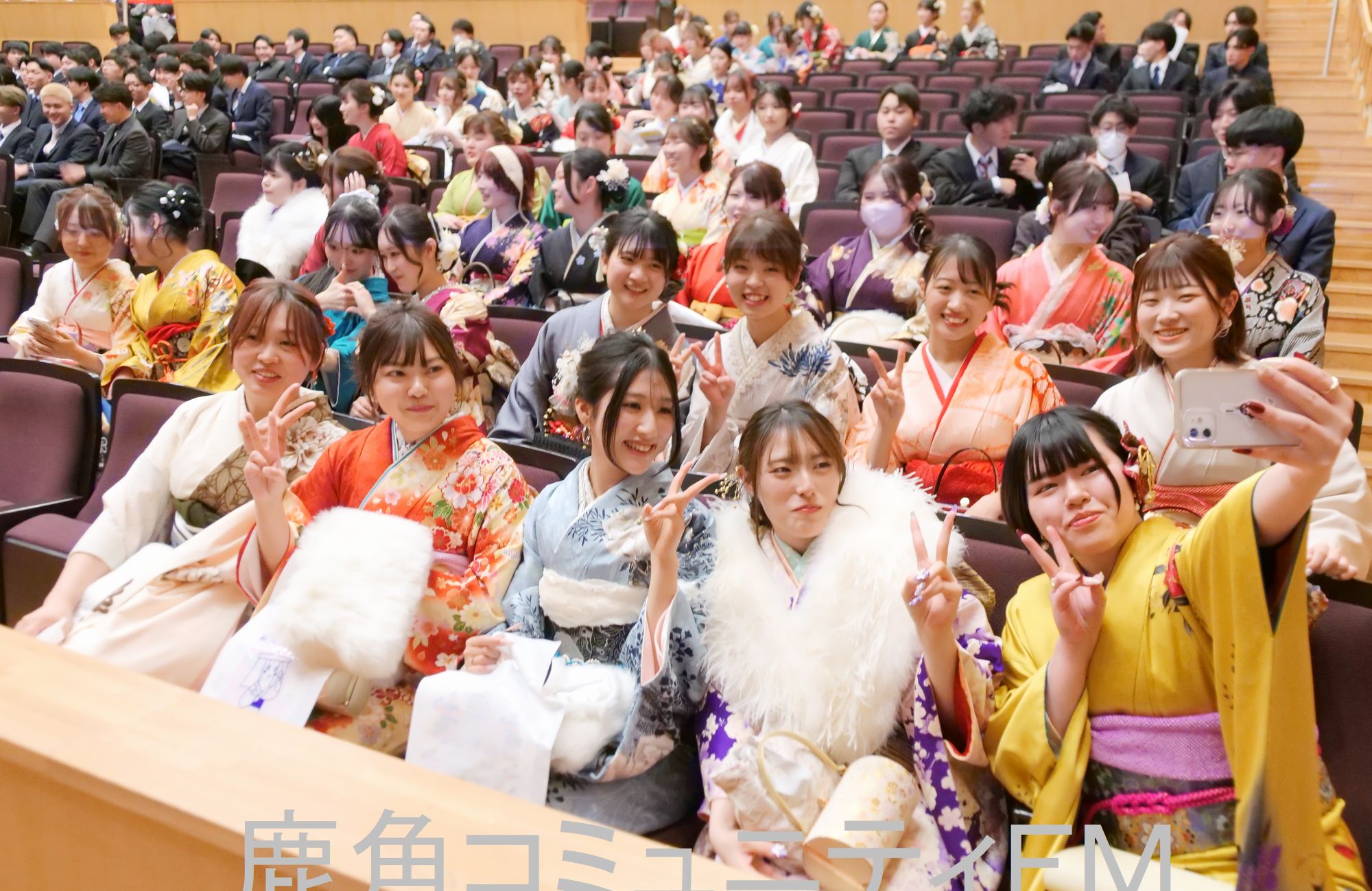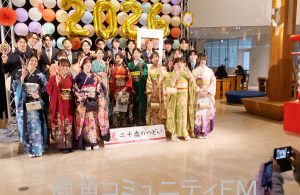 成人の日を翌日に控えた日曜の11日、雪が降るなかでしたが、式典会場の花輪の「コモッセ」は、和服やスーツを着た男女や、花輪ばやしの正装の浴衣姿も見られるなど、若い熱気と華やかさにあふれました。