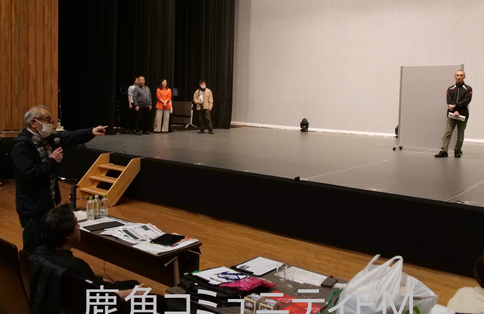 去年10月から続くけい古が、17日からはいよいよ本番と同じ舞台の上で行われ、東京の人気劇団の演出家、山崎大輔さんの指示も飛ぶなか、出演者たちが立ち位置や演技するスペースを確認するなどしていました。