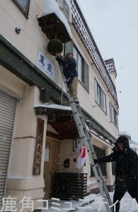 酒蔵の店先につるす「杉玉」と呼ばれる杉の葉の球を新しいものに替えて、新酒の完成を地域に知らせる儀式が、鹿角市の酒蔵で行われました。
