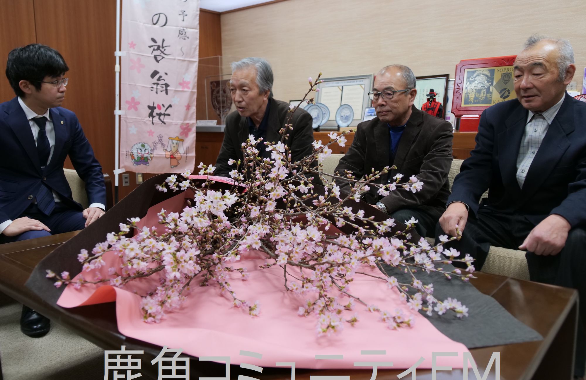 鹿角市でブランド化が進む啓翁桜の生産者たちが市役所を訪れ、真冬に満開の桜を披露しました。