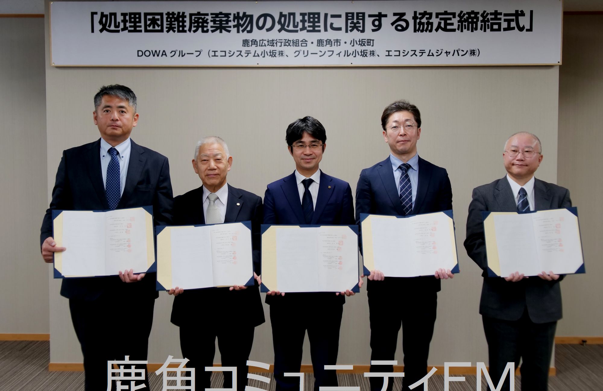 災害時の大量のごみを大規模な能力をもつ企業が処理し、いち早い復旧につなげようという協定が、鹿角市、小坂町と企業の間で結ばれました。