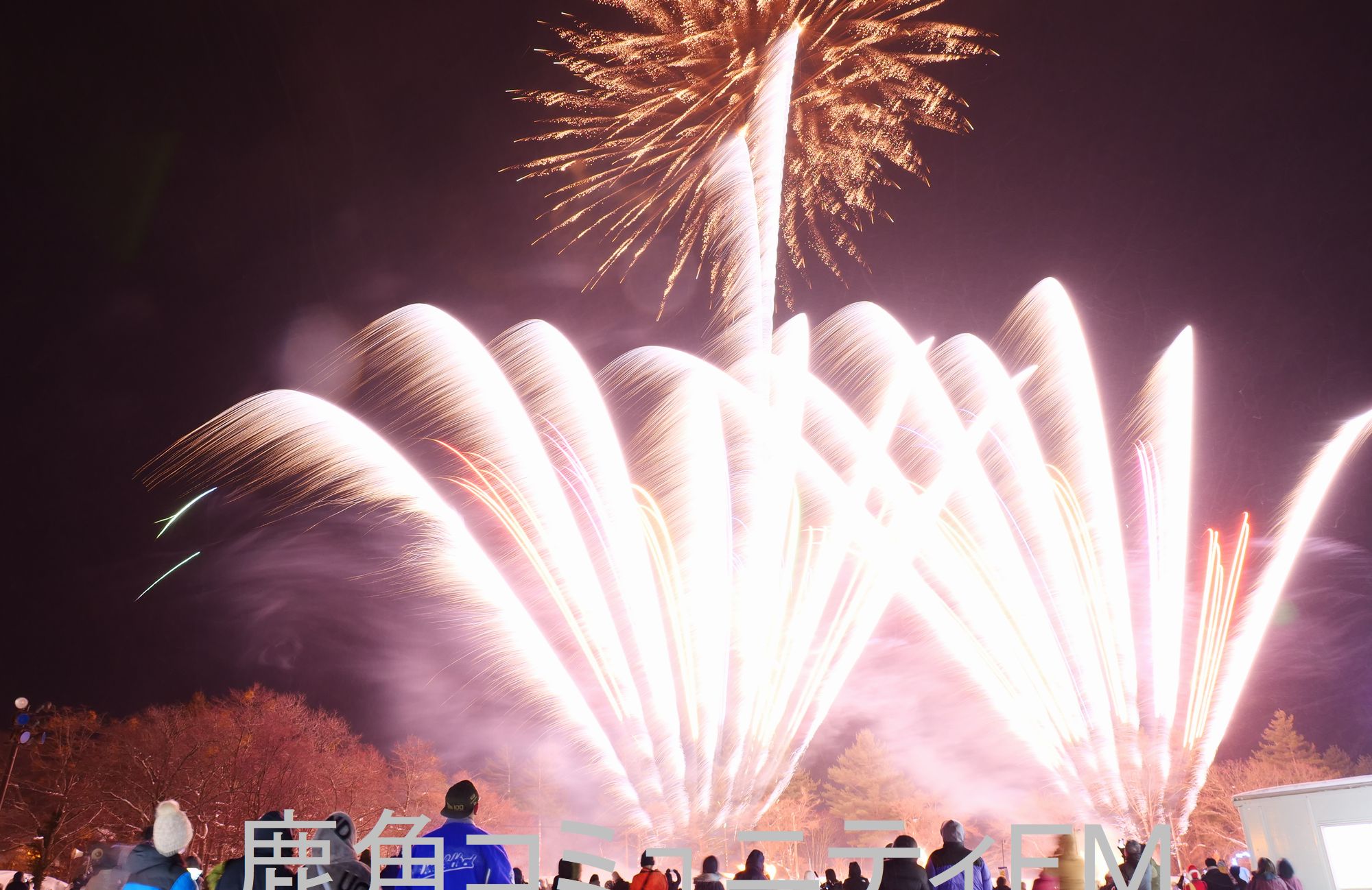 冬の澄んだ夜空を彩る、呼び物の花火は、午後8時ごろから、来場者の希望によるメッセージ付きの花火のあとに、音楽と一体のショーで打ち上げられます。