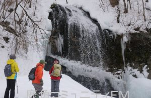 参加者たちは、白一色の森の中を歩いていきなり姿を現す、10メートル、20メートルとある滝の迫力に驚くとともに、一つずつ違う様子に喜び、しばらく眺めていたり写真を撮ったりしていました。