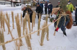 稲のわらを雪に差して、コメの豊作を祈る小正月行事が、鹿角市八幡平の集落で行われました。