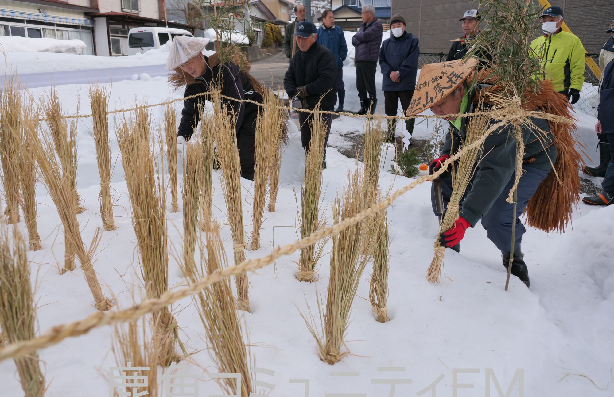 そのあと、わらで作った装束を着た男性2人が、稲わらの束を雪にていねいに差していきました。