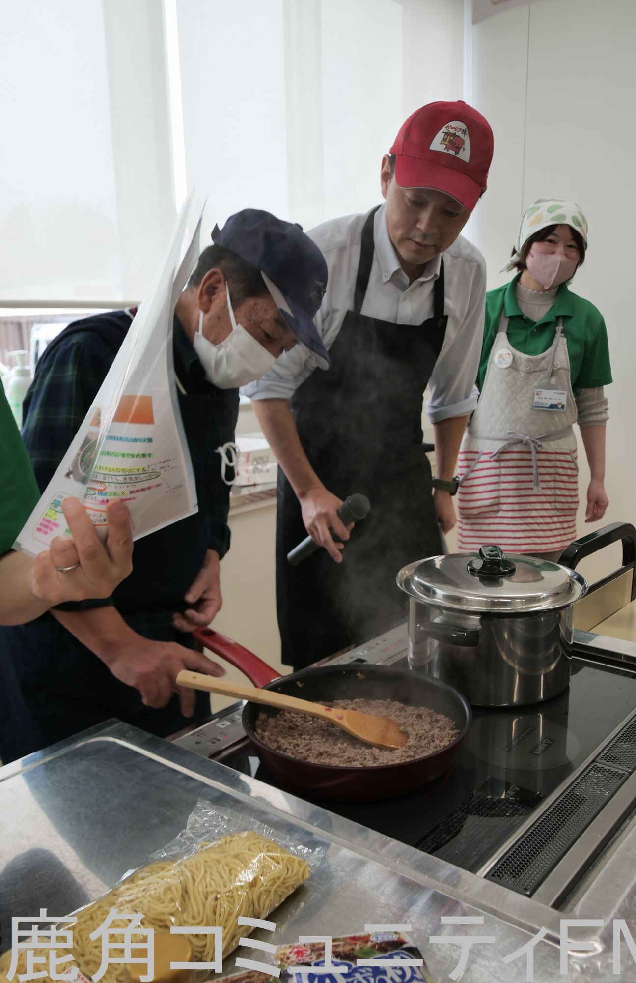 湊さんは、ひき肉をしっかりと脂が出るまで炒めることで、うま味をより多く引き出せることを説明し、参加者たちがていねいに調理していました。