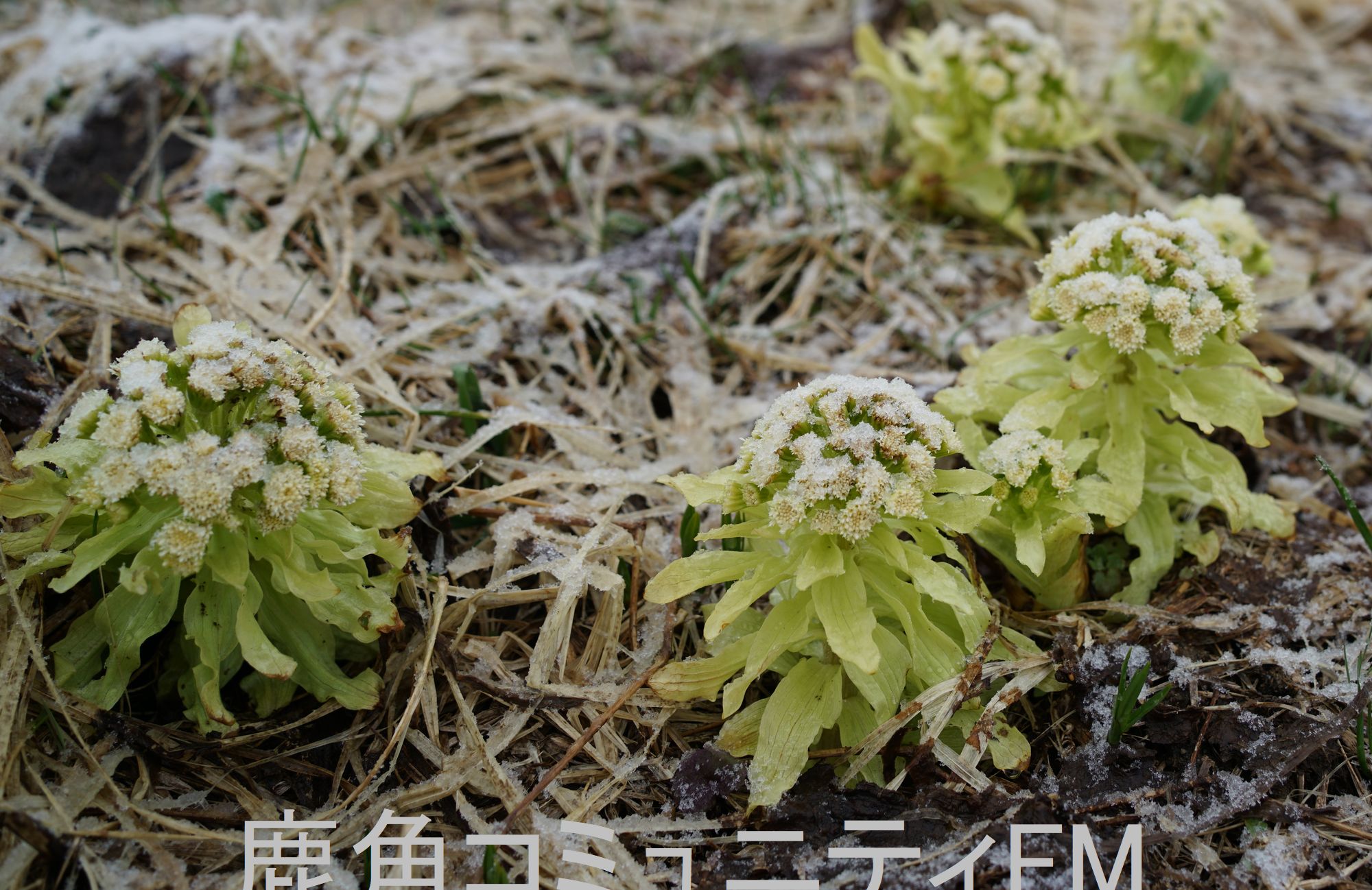 また、花輪鏡田の土手では、先月下旬の10度を超える陽気を受けて顔を出していたフキノトウやその周辺の草の上に、雪がうっすらと積もっていました。