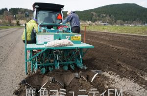 例年並みの22日、種イモの植えつけが始まり、23日も上川原の転作田を大型機械が行き来していました。