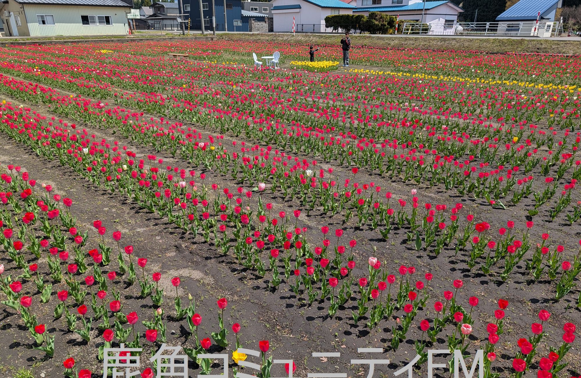 鹿角市大湯のチューリップ畑で花が一面にびっしりと咲き誇り、訪れた人たちが癒されています。